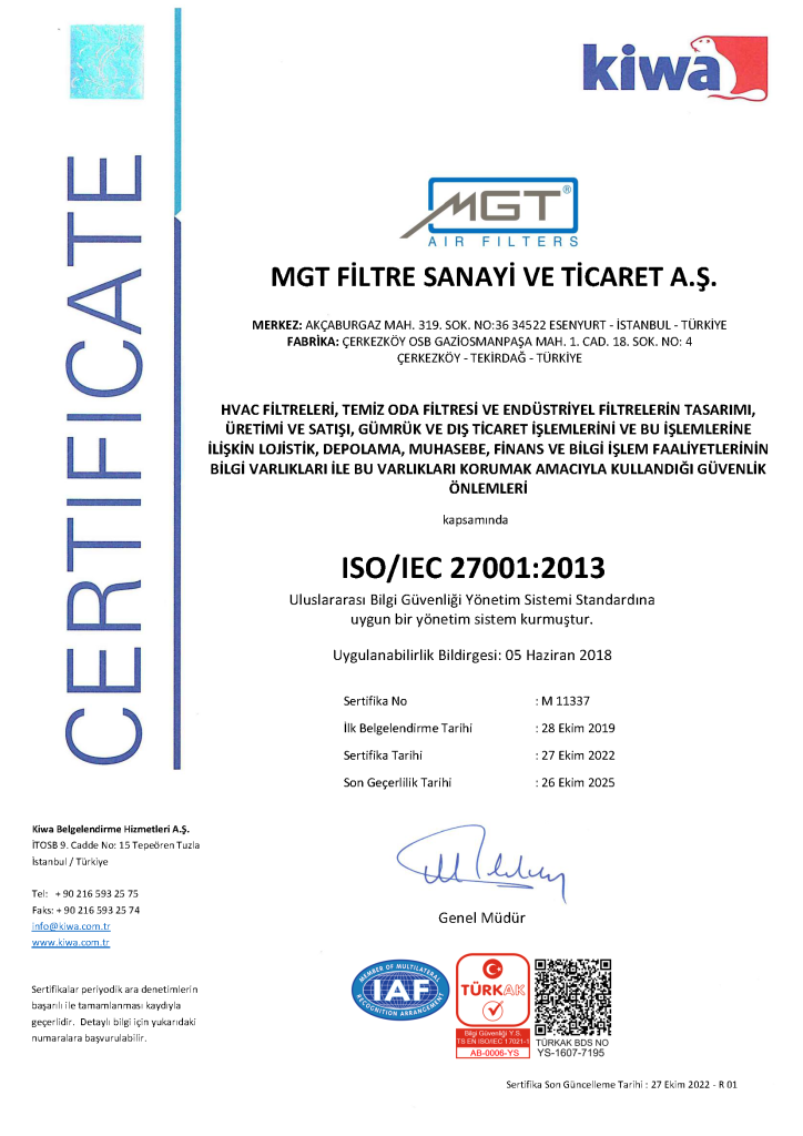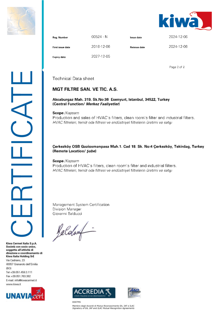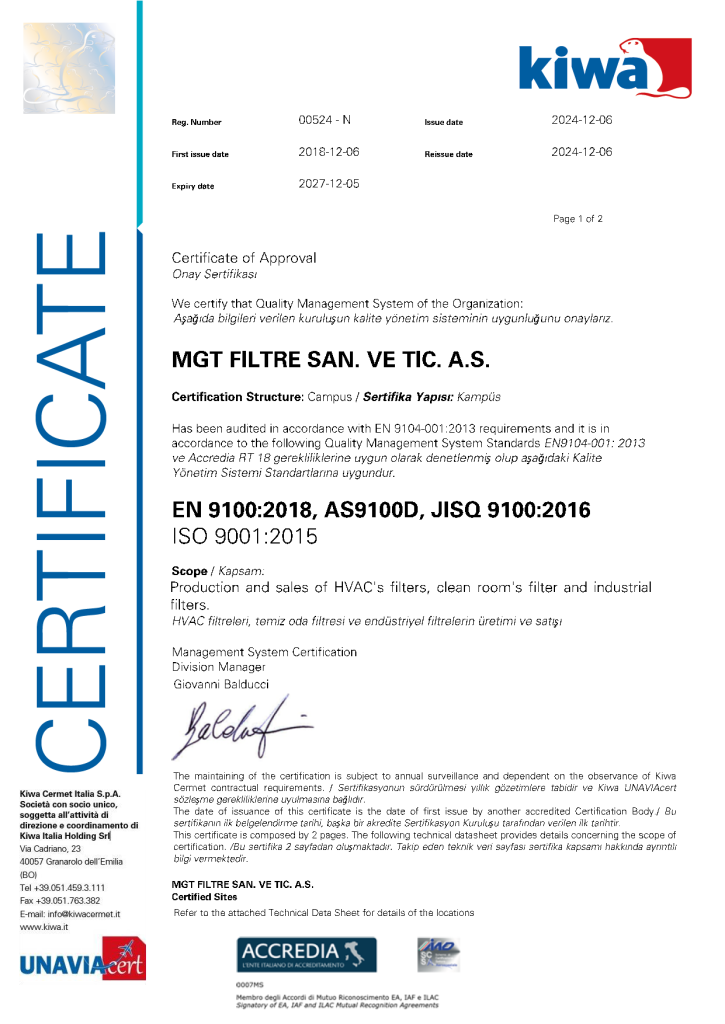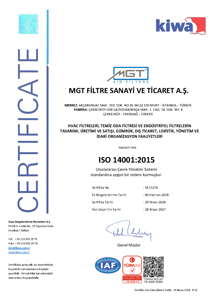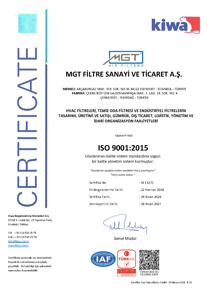 🔹 MGT FİLTRE, günümüzde var olan en saygın bağımsız sertifika kuruluşlarından biri olan Kiwa Belgelendirme tarafından denetlenerek sistemi güvence altına almaktadır. Kiwa Belgelendirme, Türkak Ulusal Akreditasyon Programı aracılığıyla akredite olan şirketlerden biridir.